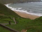 An Tra Ban, the Silverstrand, on Malainn Beag, is said to be one of teh finest beaches in Ireland. I can honestly say that getting to it is not for the faint of heart nor weak of limb. I tried to count the stairs leading down to the sandy floor of the cove. I gave up when I became enthralled by the snails slowly working their way up and down the hand rails which run the length of the stairs. again, due to the rains, I was the only human around for miles. My only companions were seabirds and sheep. I found yet another waterfall, again a side benefit to all of the rain, cutting its way down the far face of the cove. I sat on a rock for a half hour watching the waves, feeling the rain and salt spray mix. I made my way back up to the car park, thankful for the bench at the half way point which allowed me to catch my breath and take in this amazing cove from another angle.
